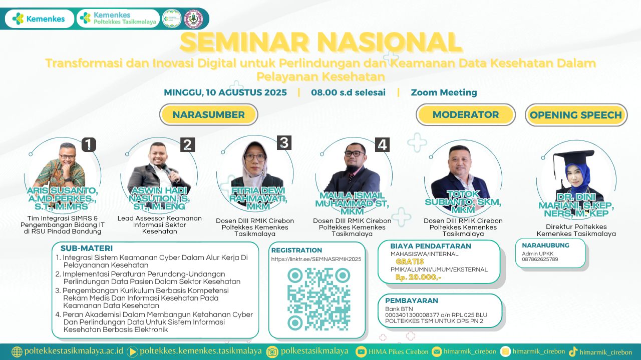 Oleh karena itu, untuk mengetahui dan lebih mendalami ilmu tentang Rekam Medis, kami Bidang Pendidikan Himpunan Mahasiswa DIII Rekam Medis dan Informasi Kesehatan, Poltekkes Kemenkes Tasikmalaya mengadakan kegiatan “SEMINAR NASIONAL REKAM MEDIS DAN INFORMASI KESEHATAN” untuk Mahasiswa Rekam Medis dan Informasi Kesehatan, Profesi Perekam Medis dan Informasi Kesehatan serta masyarakat umum.